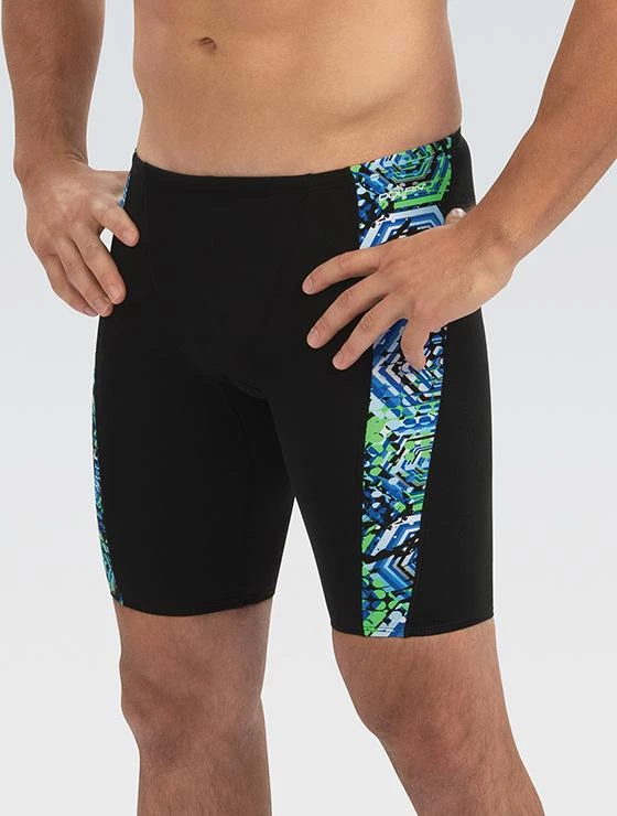 Swim in style in our athlete-approved Spliced Jammer with trendsetting blue/green Hive print along sides. Our ultra-durable RELIANCE 100% Polyester fabrication won’t let you down!