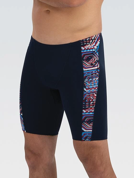 Compete at the highest level in red, white and blue Hive print spliced jammer that will hold up through the most challenging seasons. Our long-lasting RELIANCE 100% Polyester fabric maintains its flexibility and coloration, meet after meet!