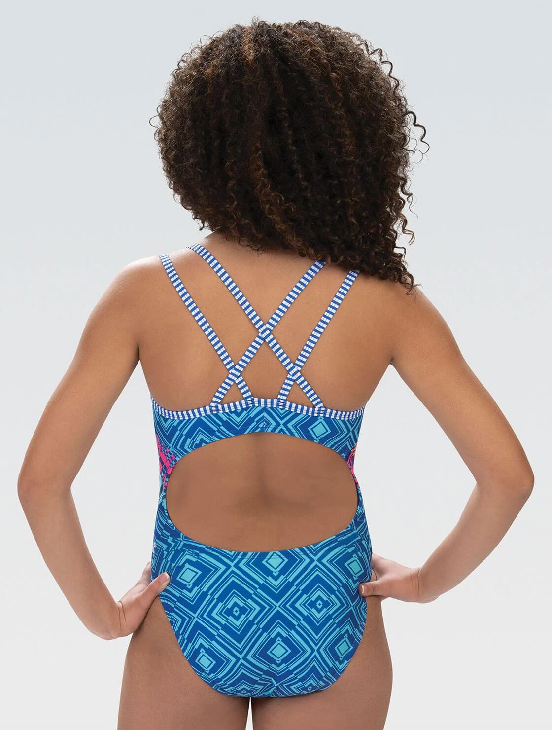 Ready to rock practice, this double strap open keyhole back features two different prints that blend so well together. This training swimsuit features a crisscross double strap back with an open keyhole while remaining strong and reliable for your toughest practice yet.