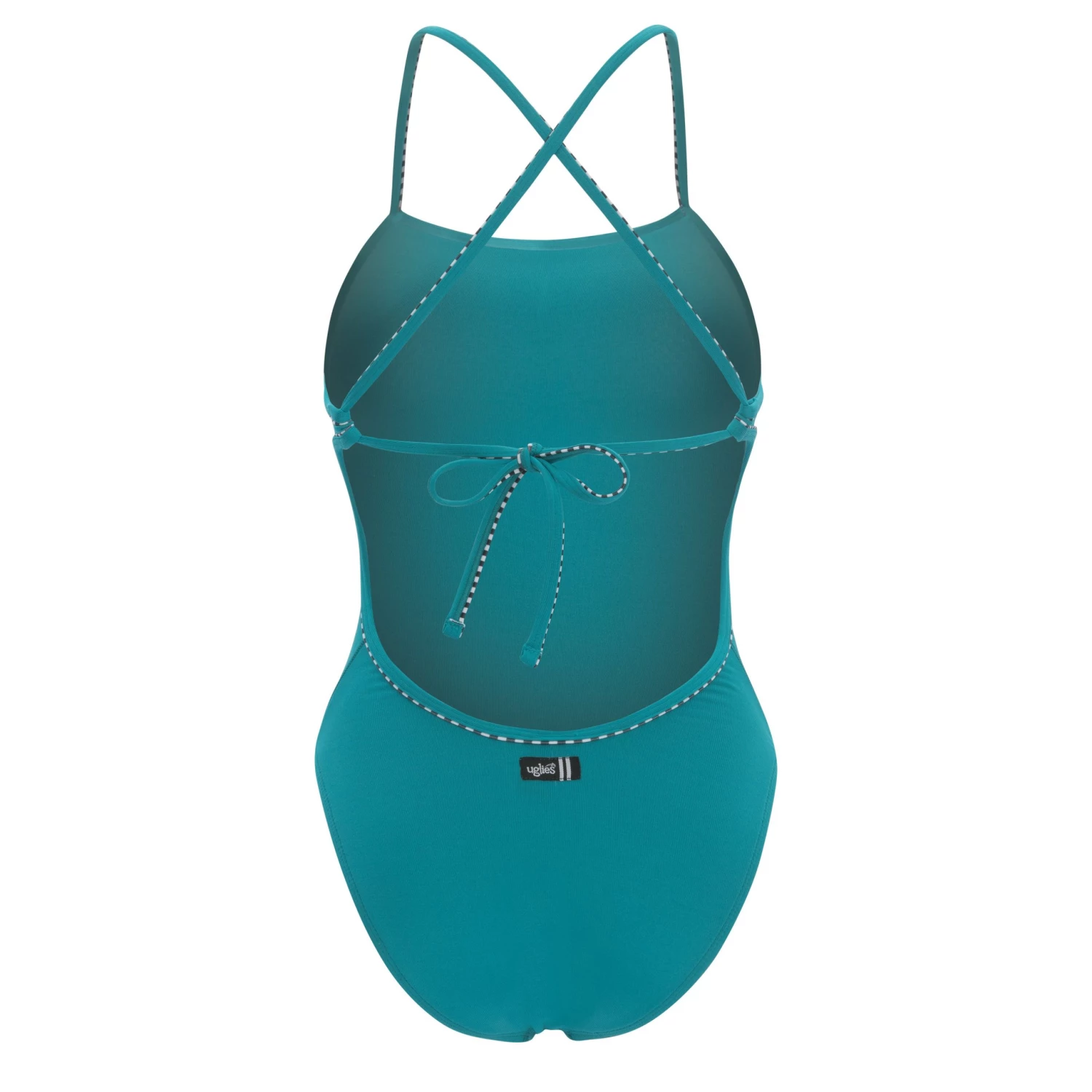 This gorgeous teal One-Piece swimsuit can take a beating from sun, sand and surf. Dolfin durable Polyester/Spandex blend keeps its shape and color, swim after swim.