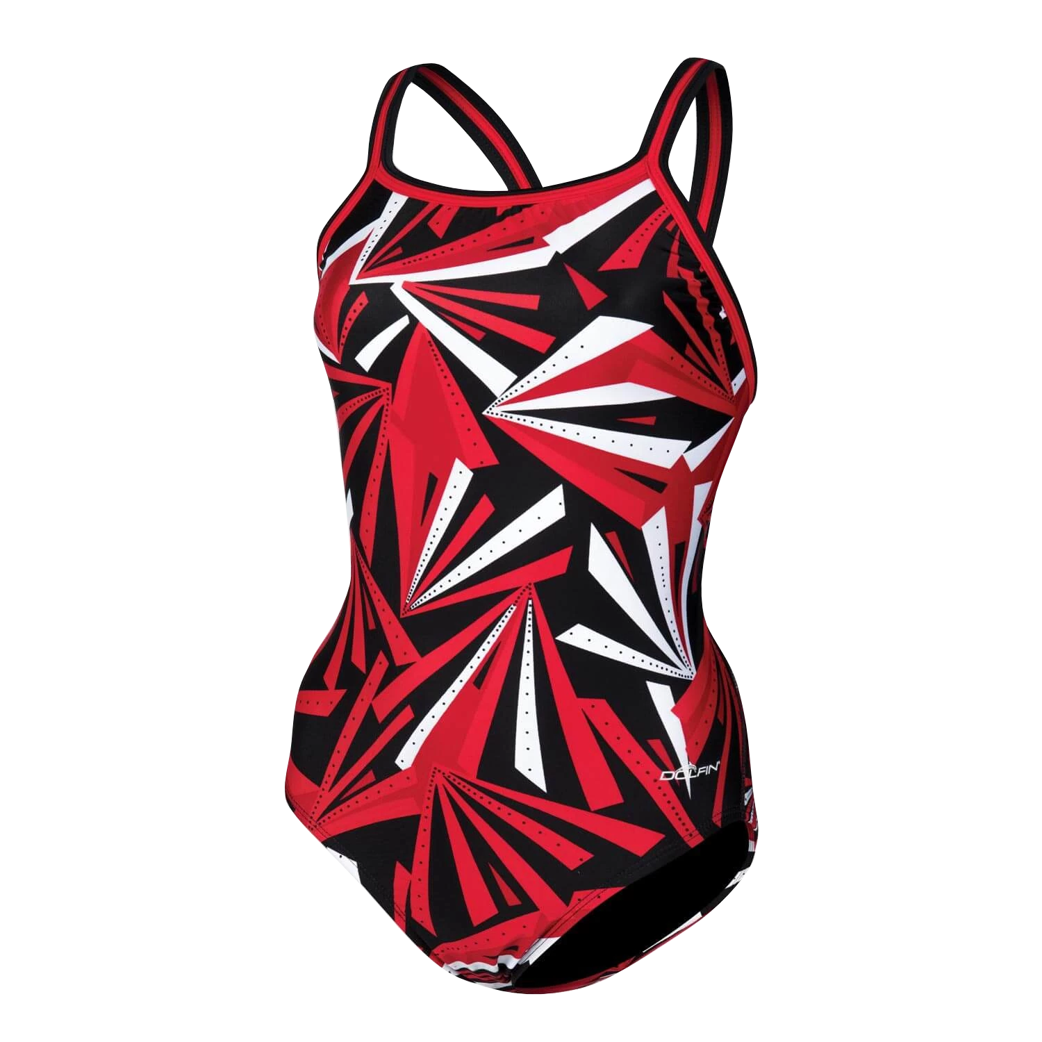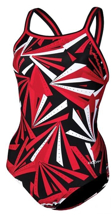 Look as fierce as the competition in this red XtraSleek ECO Spyker Team Print DBX Back One Piece Swimsuit. Resistant to running, its color stays true, lap after lap!