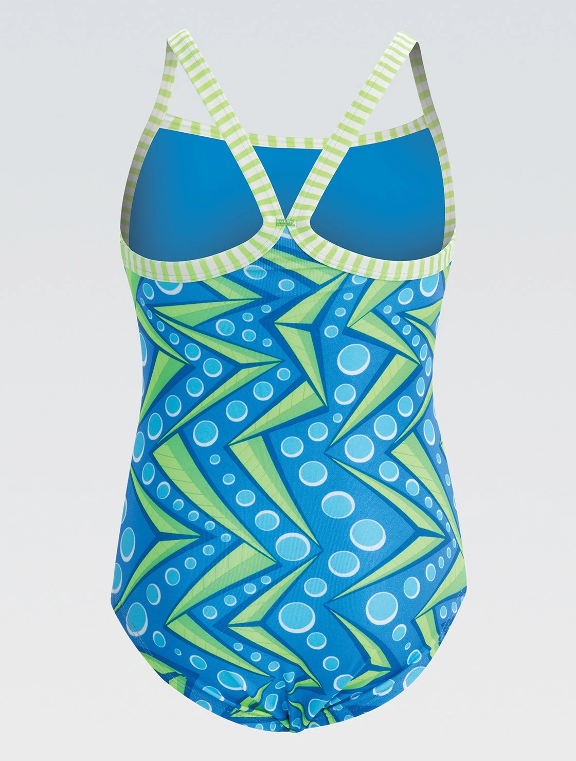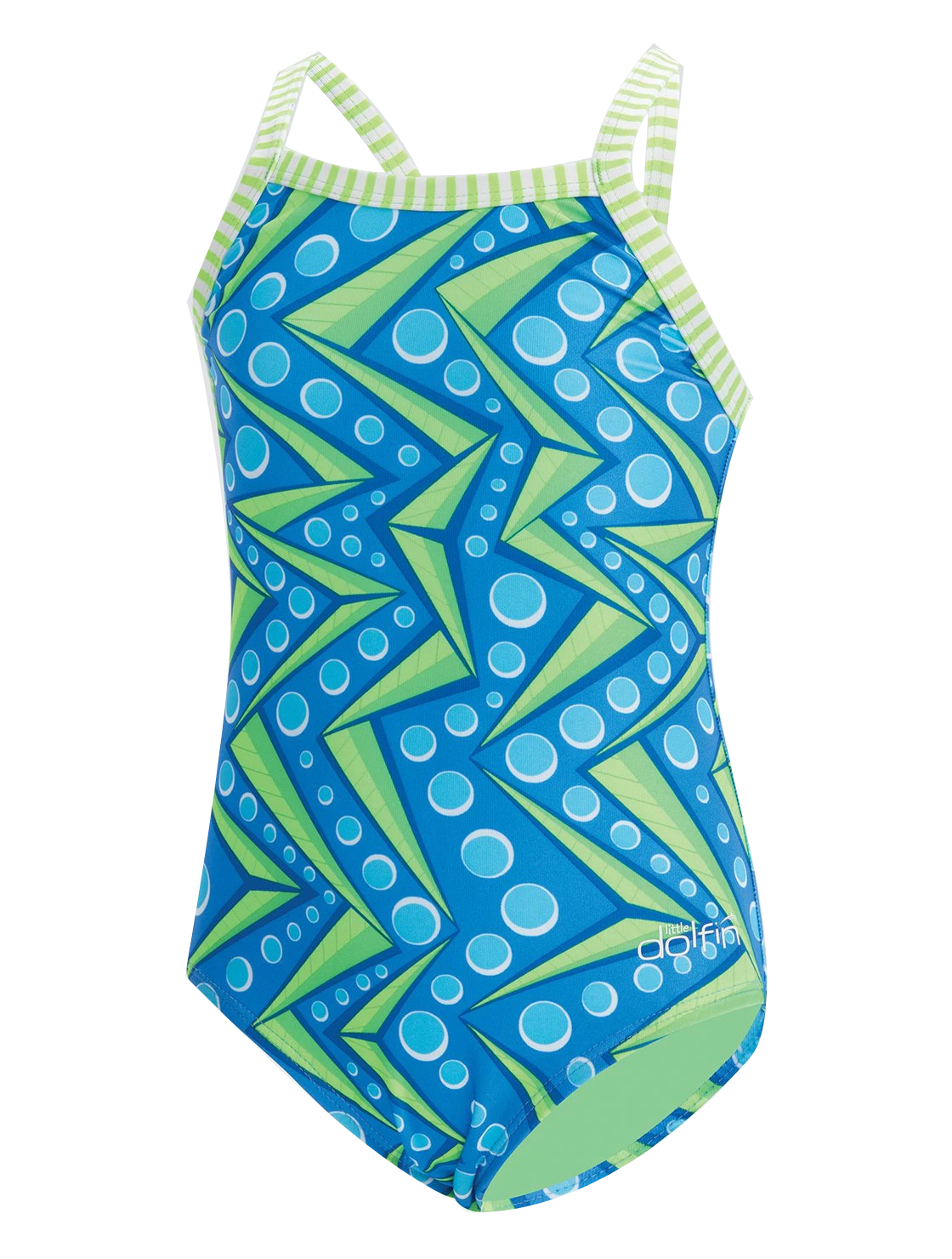This blue and green Zenon one-piece swimsuit is out of this world! Your little dolfin will love splashing around in this playful print.