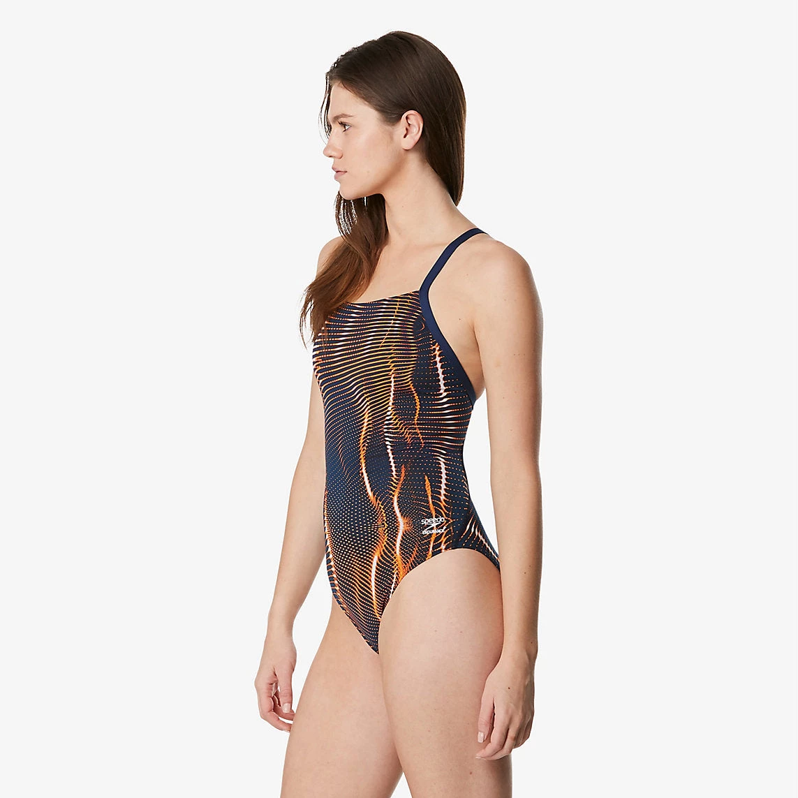 Make a statement wearing this swimsuit, in a bold fiery print. The one-piece is designed with a flyback that supports greater range of motion andis made from Endurance+ fabric that resists chlorine for a long-lasting wear.